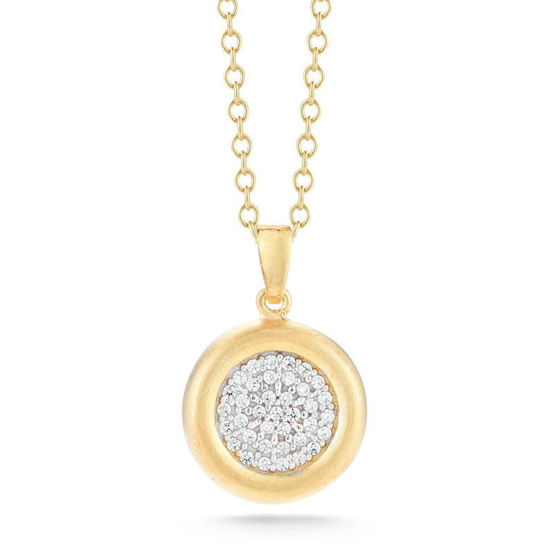 14 karat yellow gold polish-finished round pendant, centered with 0.22 carats of pave set diamonds, and sliding on a 16" rolo chain