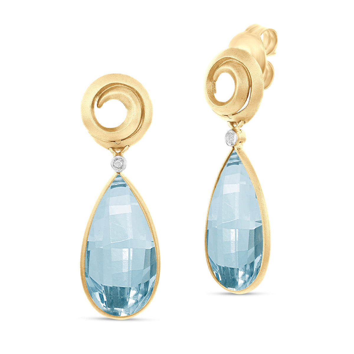 14 karat yellow gold matte-finished dangling tear-drop earrings, set with a checkerboard-cut blue topaz semi-precious color stones, and accented with 0.03 carat diamonds