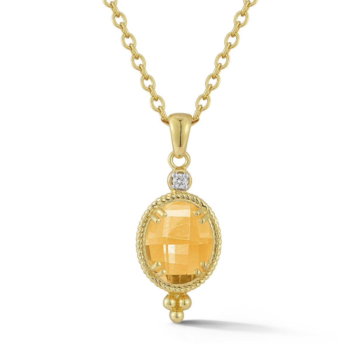 14 karat yellow gold polish-finished pendant, centered with an 8x10mm oval-shaped checkerboard-cut 2.45ct citrine semi-precious color stone surrounded by a rope embellishment, accented with 0.035 carats of a bezel set diamond, sliding on a 16" rolo chain