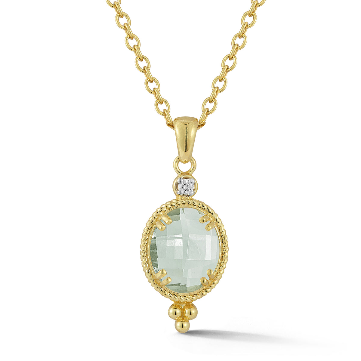 14 karat yellow gold polish-finished pendant, centered with an 8x10mm oval-shaped checkerboard-cut 2.45ct green amethyst semi-precious color stone surrounded by a rope embellishment, accented with 0.035 carats of a bezel set diamond, sliding on a 16" rolo chain