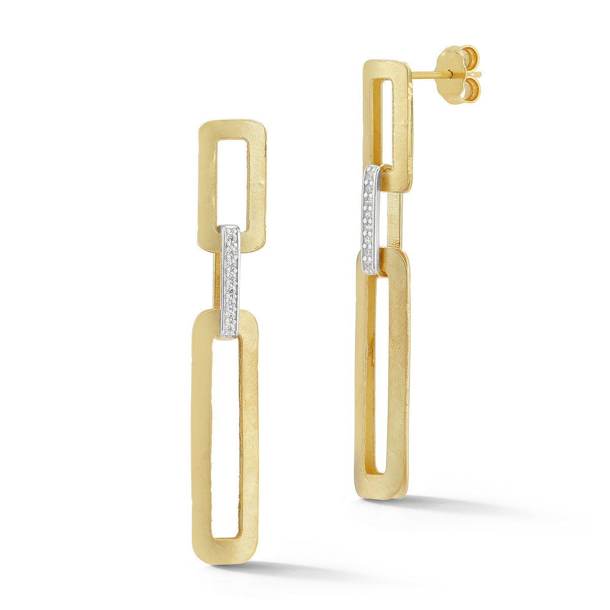 14 karat yellow gold matte-finished drop rectangle-shaped open-link earrings, accented with 0.10 carats of pave set diamonds