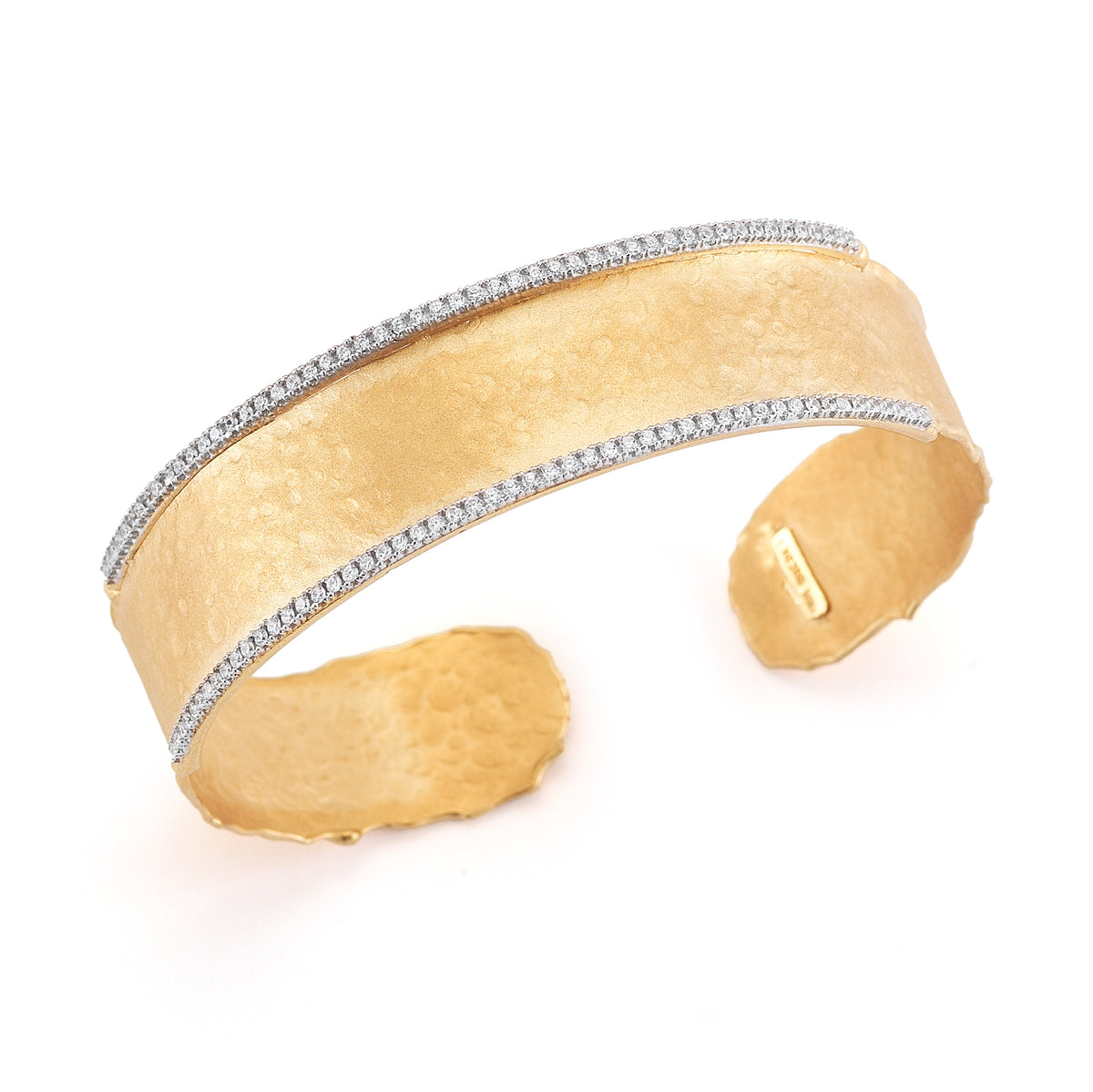 14 karat yellow gold matte and hammer-finish narrow cuff bracelet accented with 0 80 carat of pave set diamonds
