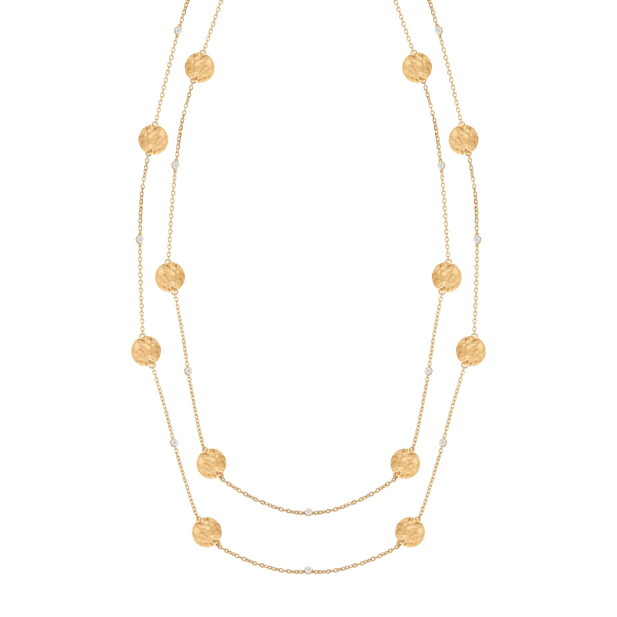 14 karat yellow gold matte and hammer-finished 36 wrap-around disk motif gold-by-the-yard necklace accented with 0 20 carats of bezel set diamonds