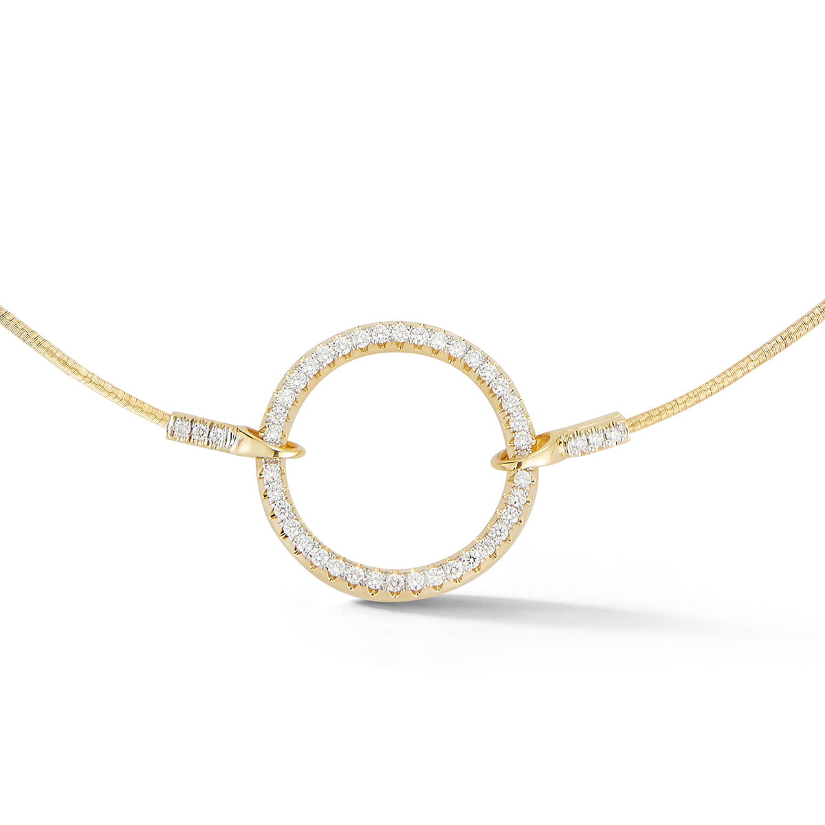 14 karat yellow gold open circle cocoon necklace enhanced with 0 75 carats of pave set diamonds