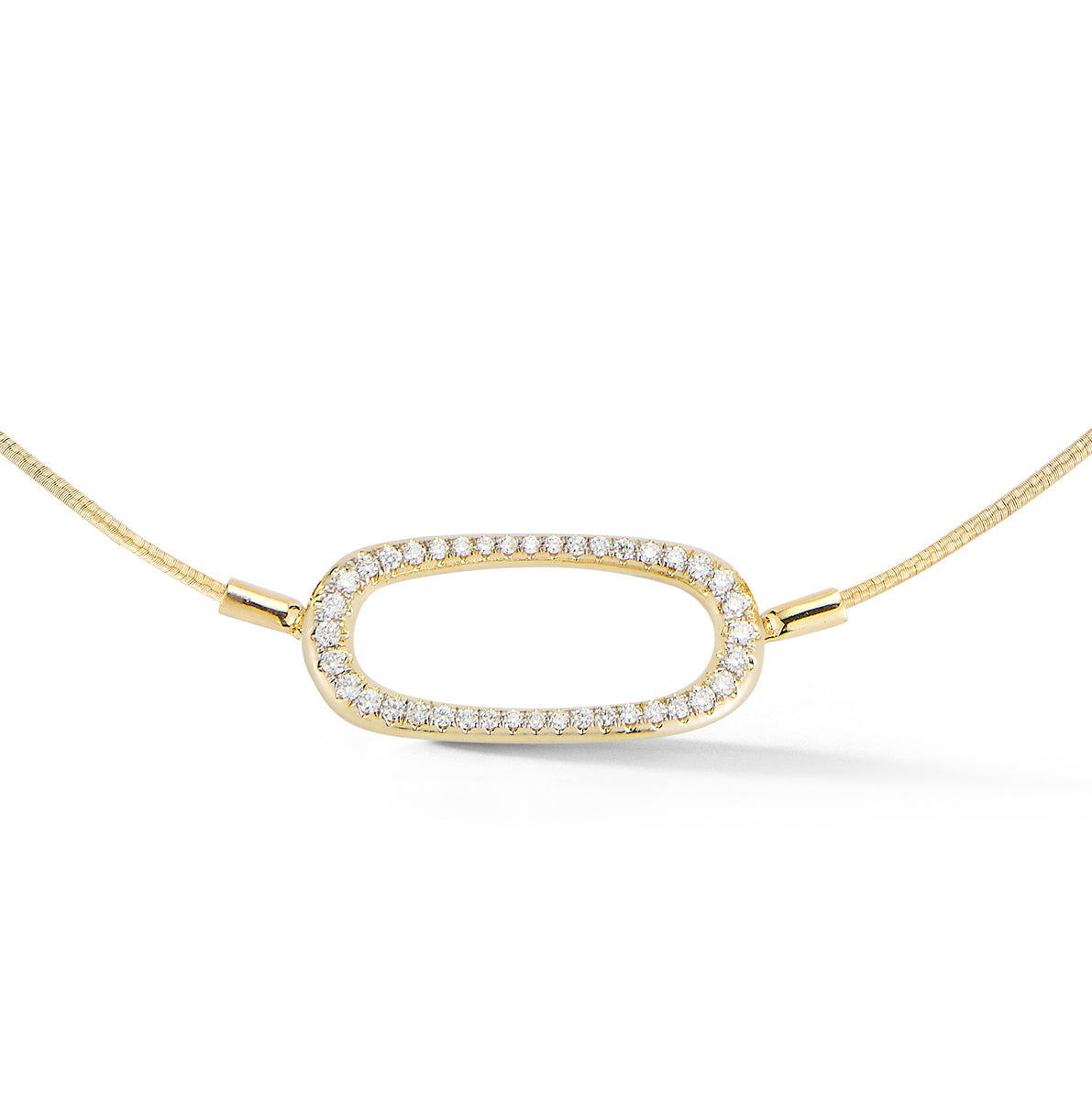 14 karat yellow gold east-to-west open ellipse cocoon neck accented with 0 75 carats of pave set diamonds