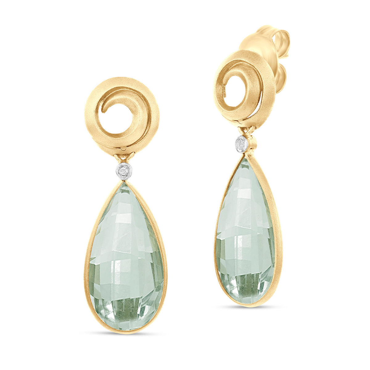 14 karat yellow gold matte-finished dangling tear-drop earrings, set with a checkerboard-cut green amethyst semi-precious color stones, and accented with 0.03 carat diamonds