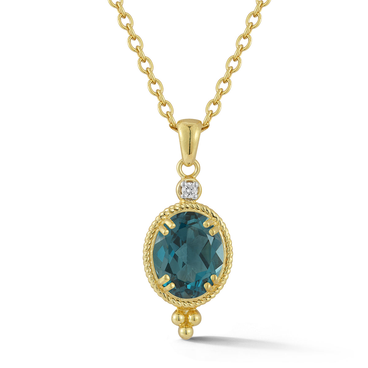 14 karat yellow gold polish-finished pendant, centered with an 8x10mm oval-shaped checkerboard-cut 3.15ct london blue semi-precious color stone surrounded by a rope embellishment, accented with 0.035 carats of a bezel set diamond, sliding on a 16" rolo chain