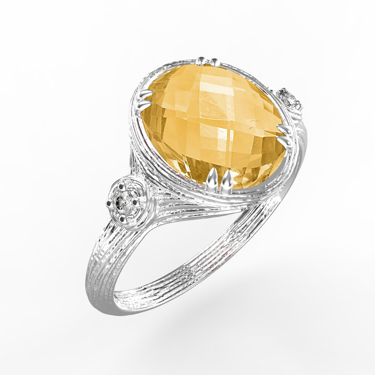 14 karat yellow gold etched and polish-finished cocktail ring, centered with an 8x10mm oval-shaped faceted 2.34ct citrine semi-precious color stone, accented with 0.05 carats of bezel set diamonds