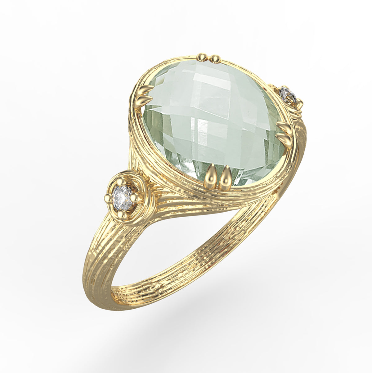 14 karat yellow gold etched and polish-finished cocktail ring, centered with an 8x10mm oval-shaped faceted 2.45ct green amethyst semi-precious color stone, accented with 0.05 carats of bezel set diamonds