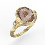 14 karat yellow gold etched and polish-finished cocktail ring, centered with an 8x10mm oval-shaped faceted 2.45ct smokey topaz semi-precious color stone, accented with 0.05 carats of bezel set diamonds
