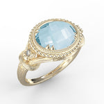 14 karat yellow gold etched embellished and polish-finished cocktail ring, centered with an 8x10mm checkerboard-cut oval-shaped 3.0ct blue topaz semi-precious color stone, accented with 0.05 carats of bezel set diamonds