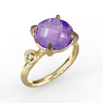 14 karat yellow gold etched and polish-finished cocktail ring, centered with a 10mm checkerboard-cut 10mm round 3.25ct amethyst semi-precious color stone, and accented with 0.05 carats of bezel set diamonds