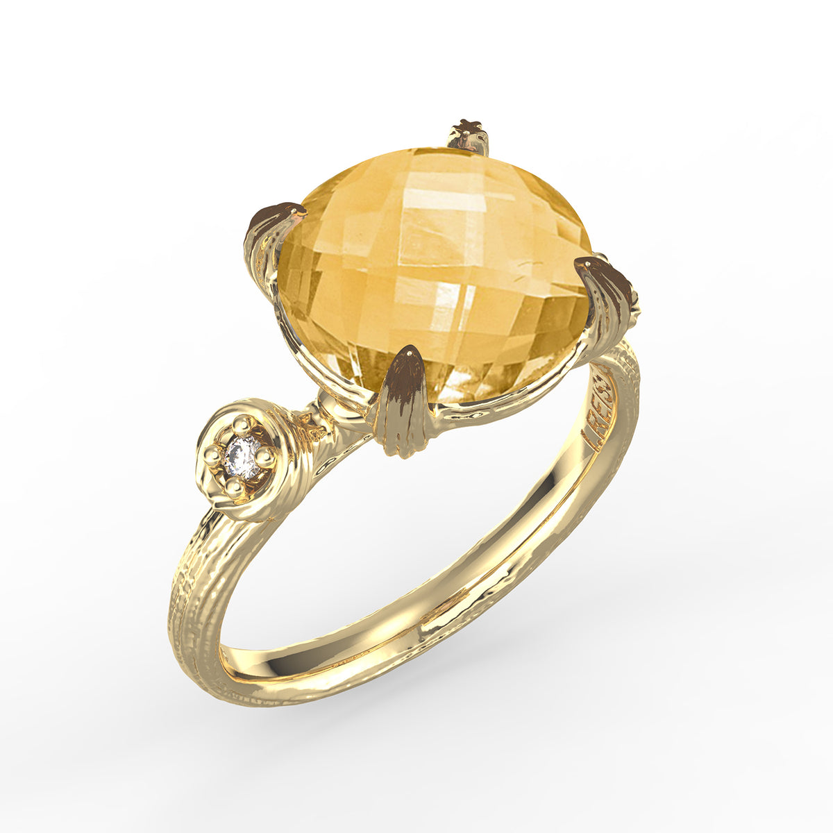 14 karat yellow gold etched and polish-finished cocktail ring, centered with a 10mm checkerboard-cut 10mm round 3.35ct citrine semi-precious color stone, and accented with 0.05 carats of bezel set diamonds