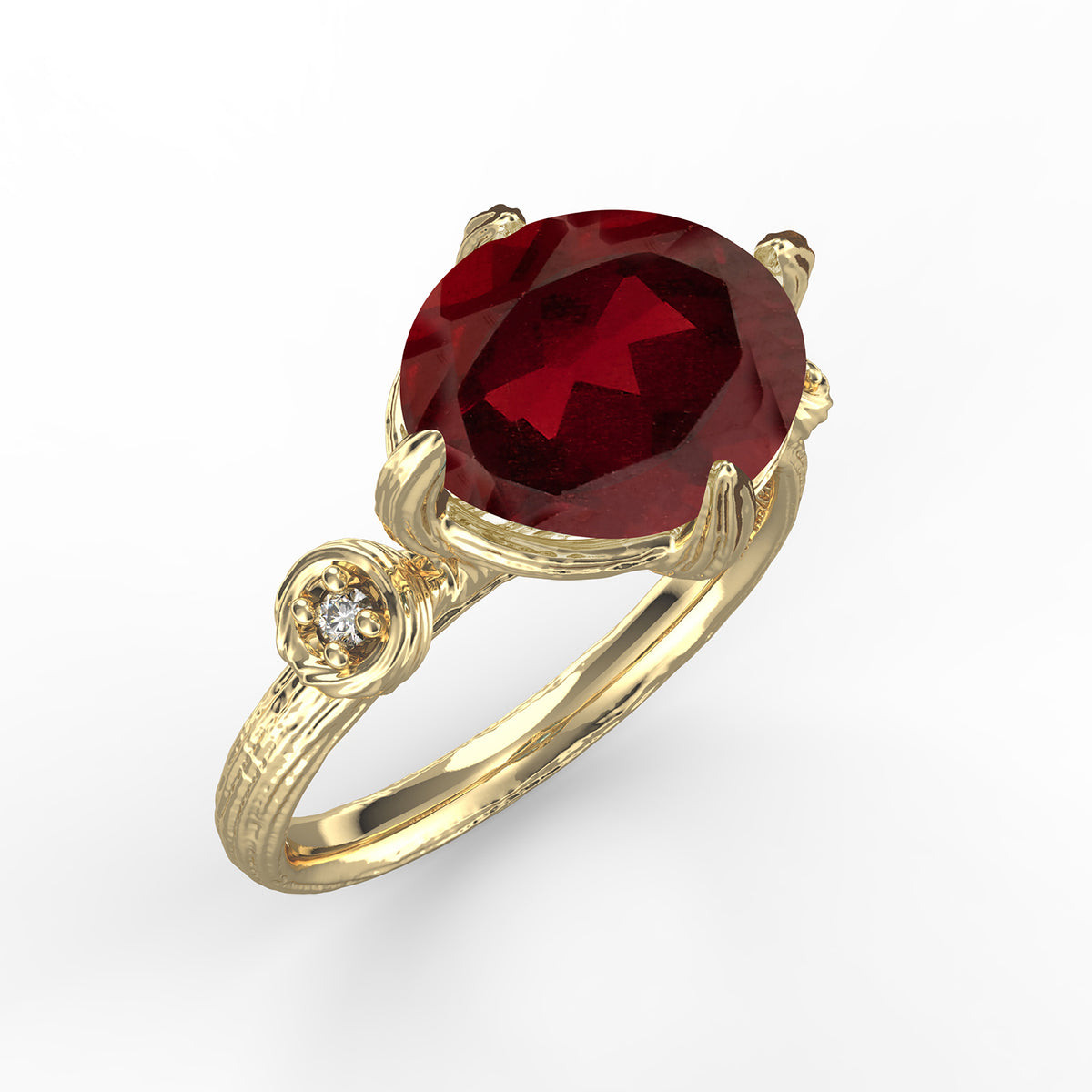 14 karat yellow gold etched and polish-finished cocktail ring, centered with an 10x8mm oval-shaped faceted 3.5ct garnet semi-precious color stone, accented with 0.05 carats of bezel set diamonds