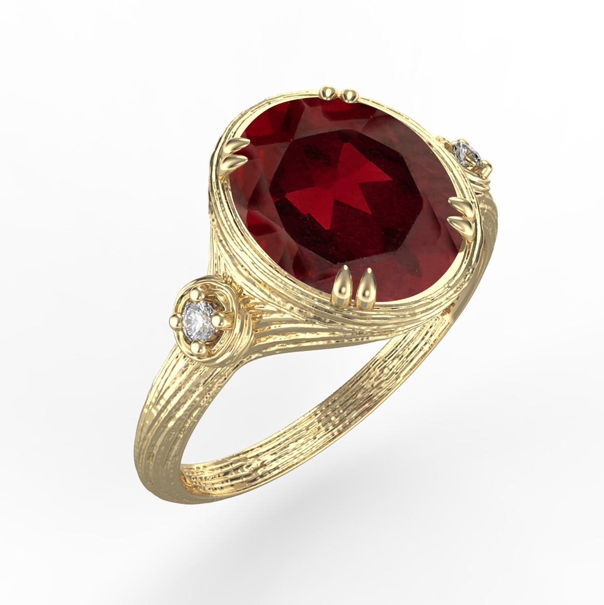 14 karat yellow gold etched and polish-finished cocktail ring, centered with an 8x10mm oval-shaped faceted 3.5ct garnet semi-precious color stone, accented with 0.05 carats of bezel set diamonds