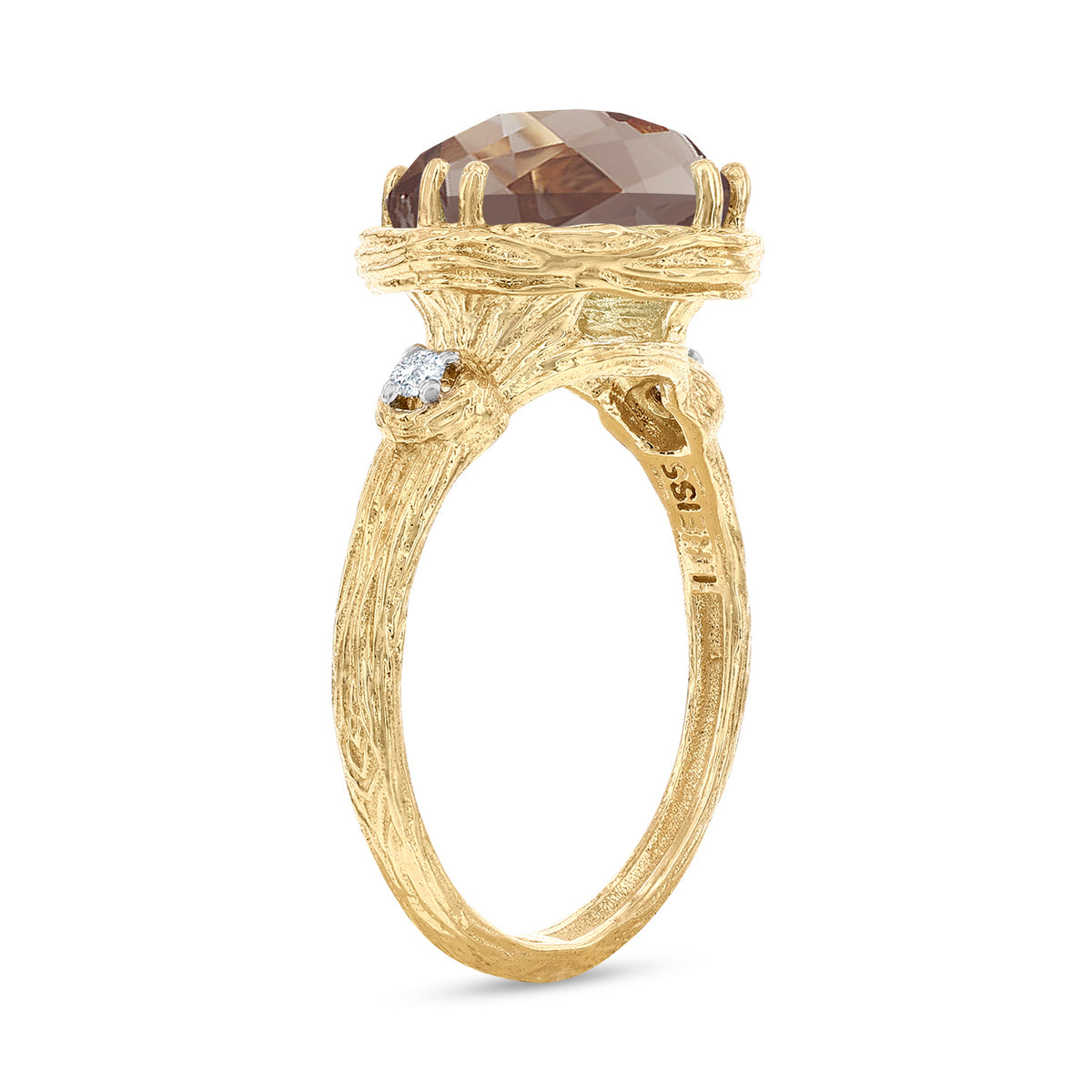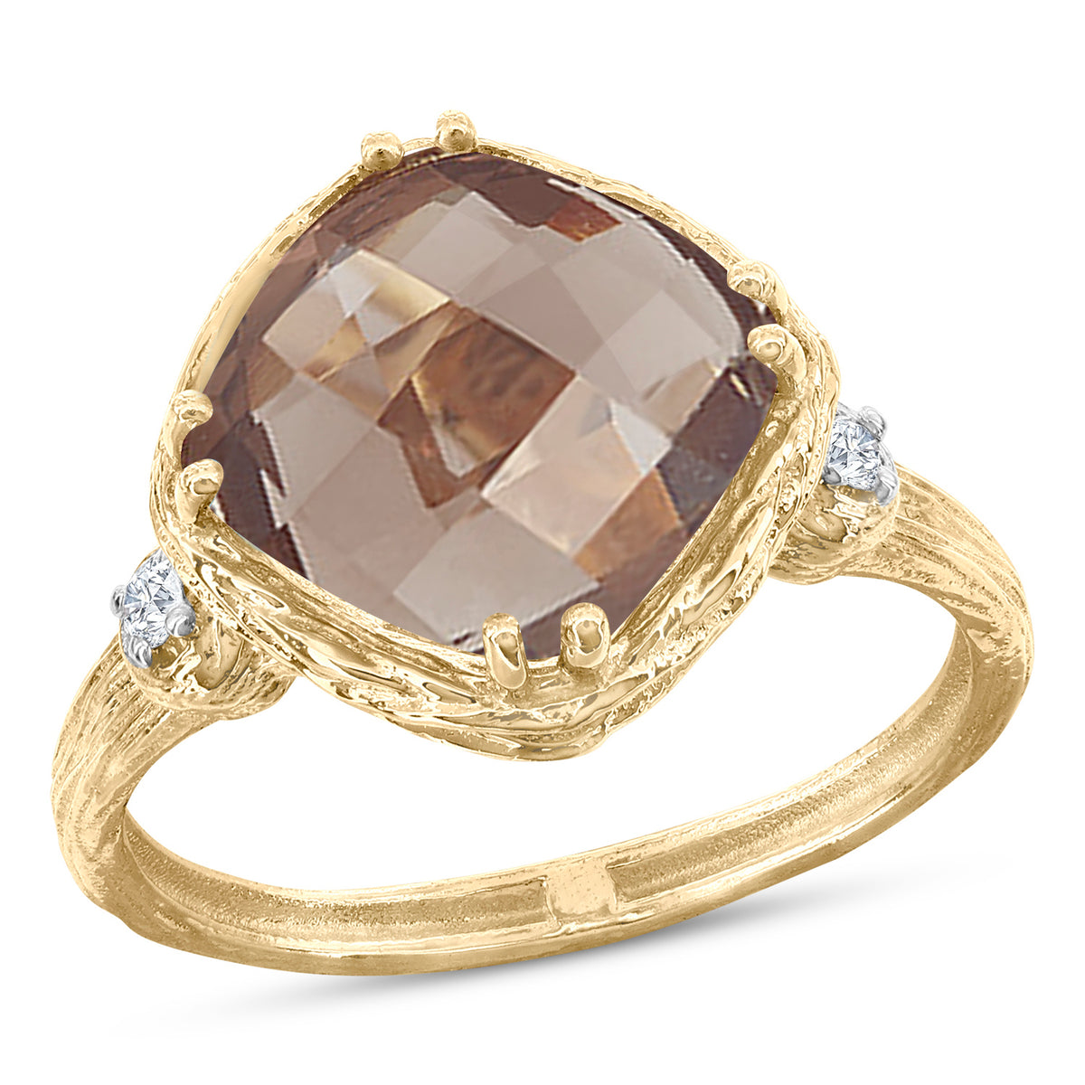 14 karat yellow gold etched and polish-finished cocktail ring, centered with a 10mm checkerboard-cut cushion-shaped 3.5ct smokey topaz semi-precious color stone, and accented with 0.05 carats of bezel set diamonds