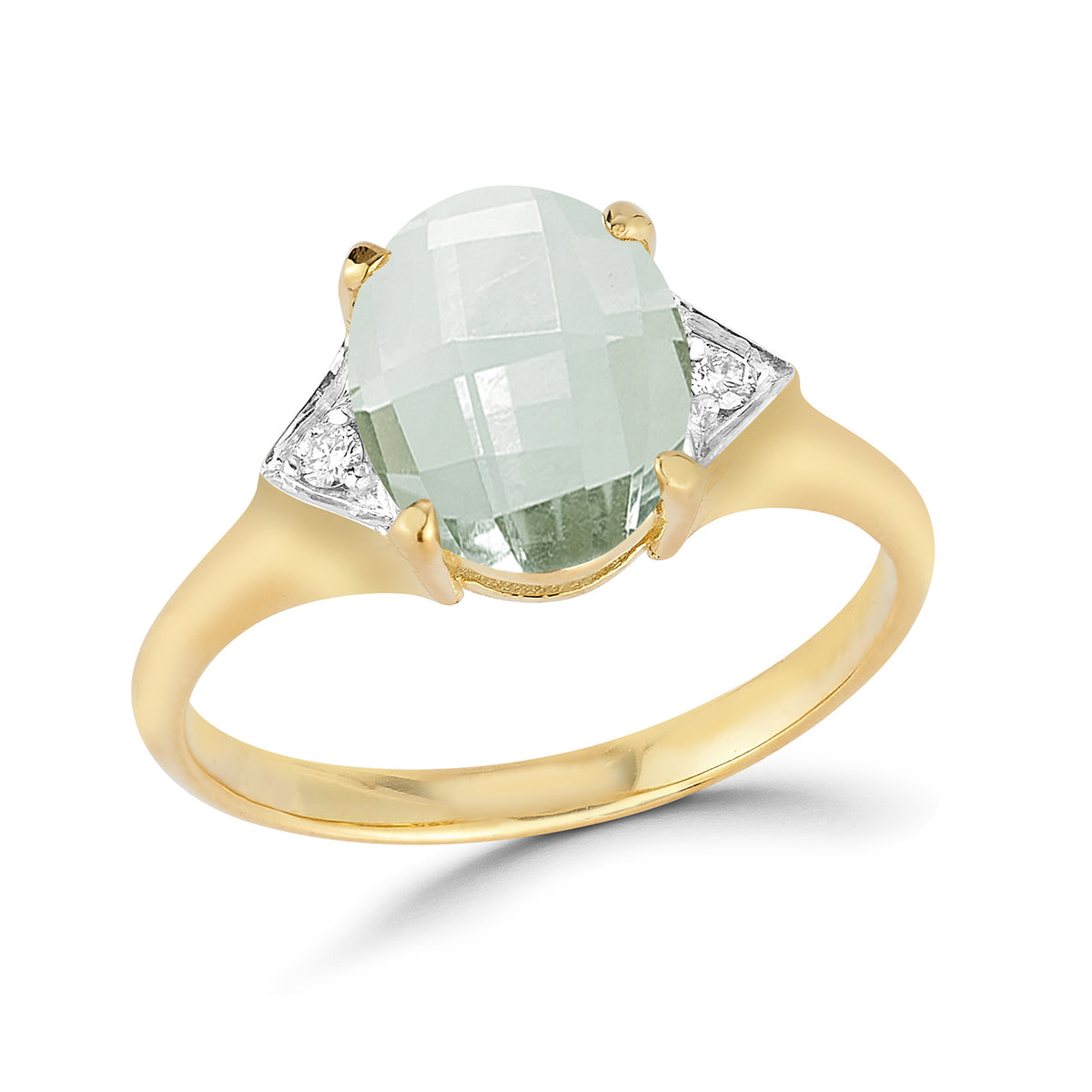 14 karat yellow gold polish-finished cocktail ring, centered with a 14x10mm oval-shaped checkerboard cut 5.25ct green amethyst semi-precious color stone and accented with 0.05 carats of pave set diamonds