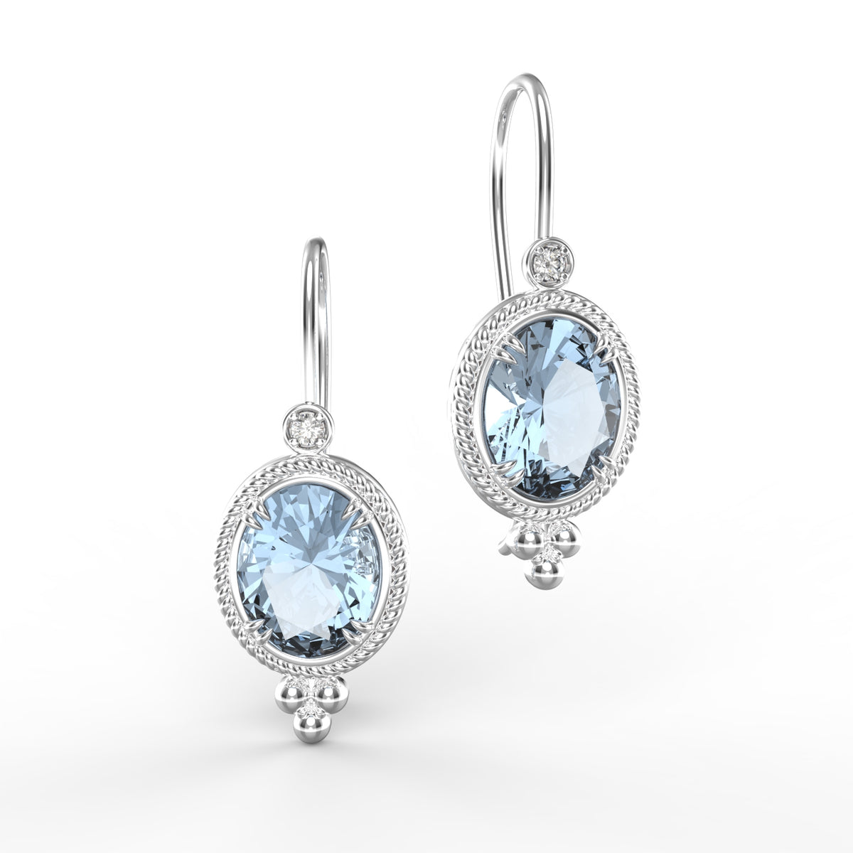14 karat white gold polish-finished beaded drop earrings, set with an 8x10mm 6.6ct checkerboard cut oval-shaped blue topaz semi-precious color stones and accented with 0.07 carat diamonds