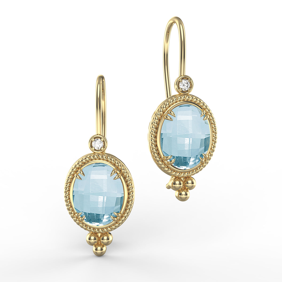 14 karat yellow gold polish-finished beaded drop earrings, set with an 10x14mm 6.6ct checkerboard cut oval-shaped blue topaz semi-precious color stones and accented with 0.07 carat diamonds