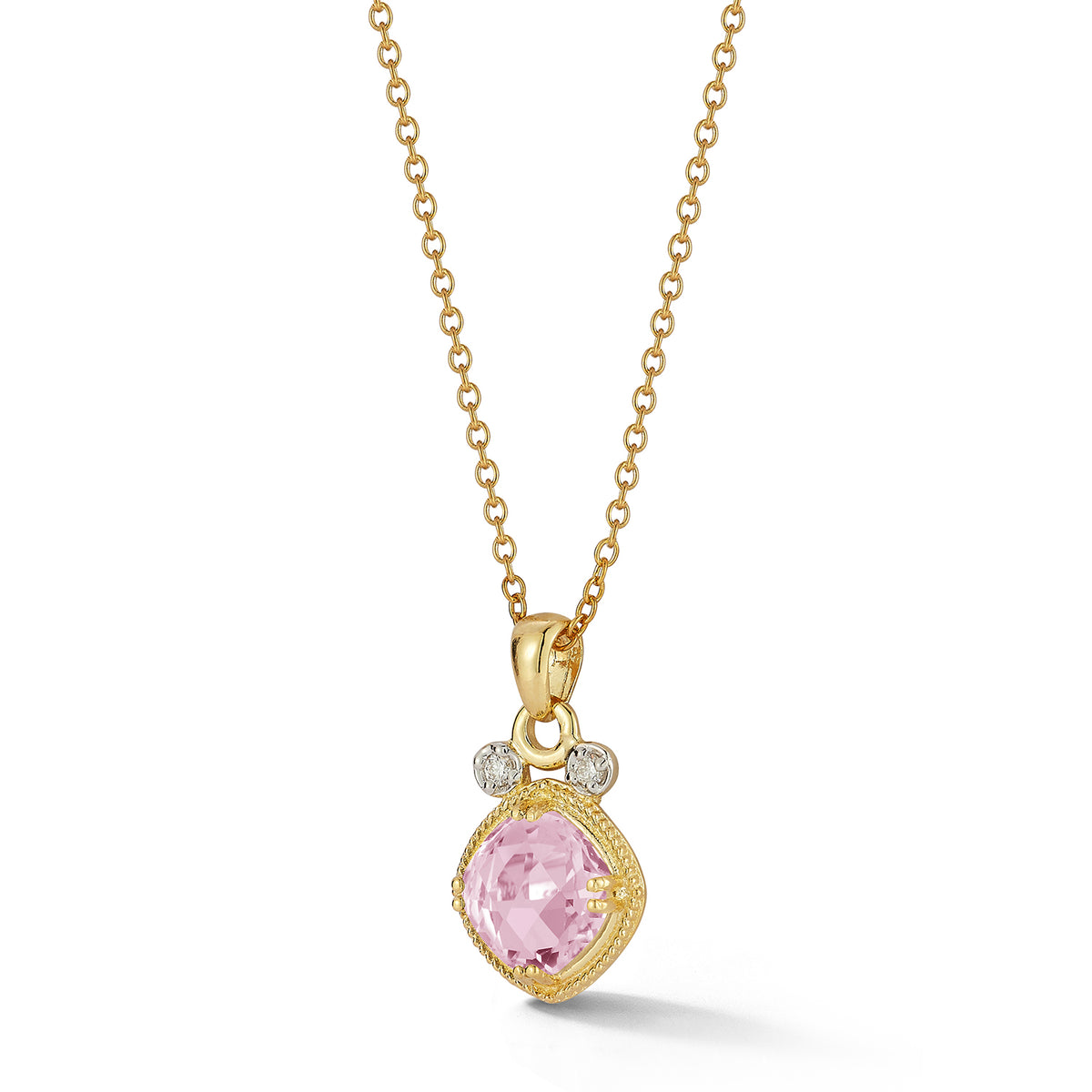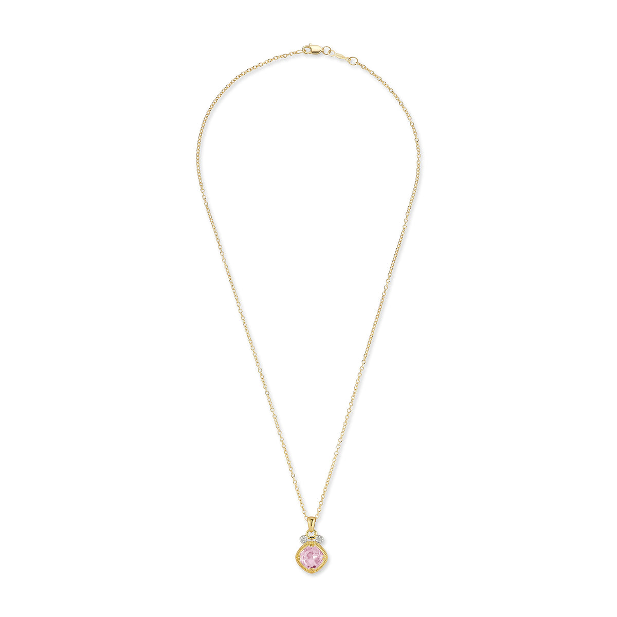 14 karat yellow gold polish-finished color stone pendant, centered with a beaded-framed 8mm 2.0ct checkerboard-cut cushion shaped rose quartz semi-precious color stone, accented with 0.07 carats of bezel set diamonds and sliding on a 16" rolo chain