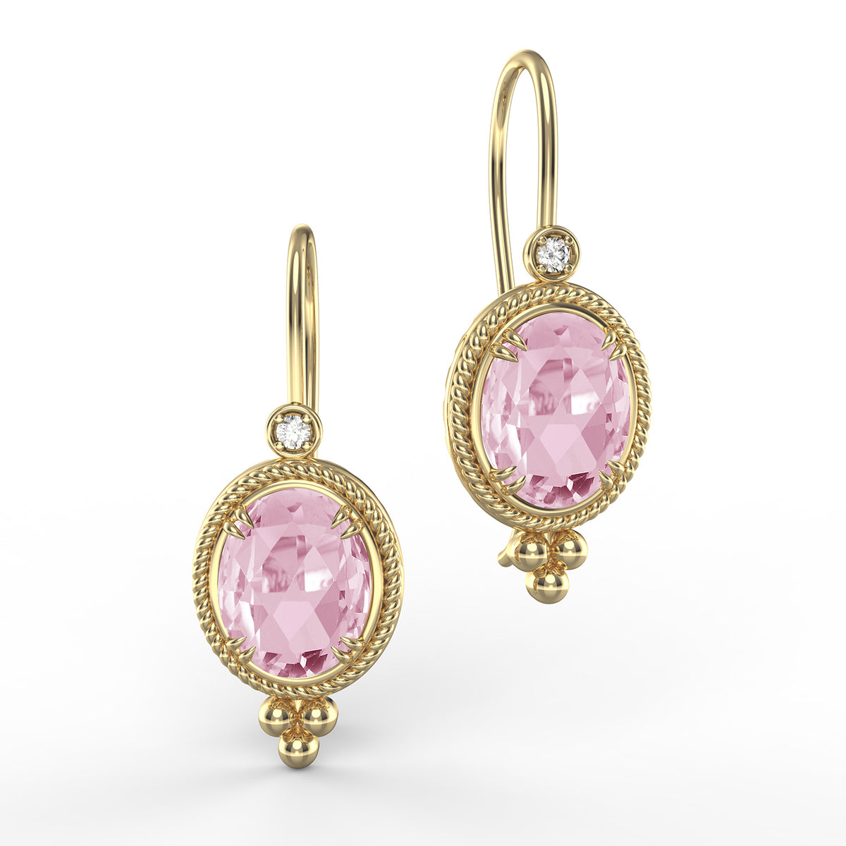 14 karat yellow gold polish-finished beaded drop earrings, set with an 8x10mm 4.9ct checkerboard cut oval-shaped rose quartz semi-precious color stones and accented with 0.07 carat diamonds