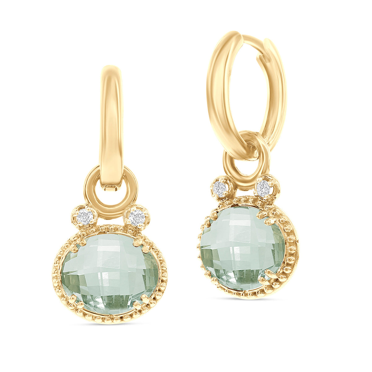 14 karat yellow gold polish-finished hoop earrings, set with a dangling 5ct 8x10mm checkerboard-cut oval-shaped green amethyst semi-precious color stones and accented with 0.10 carat diamonds