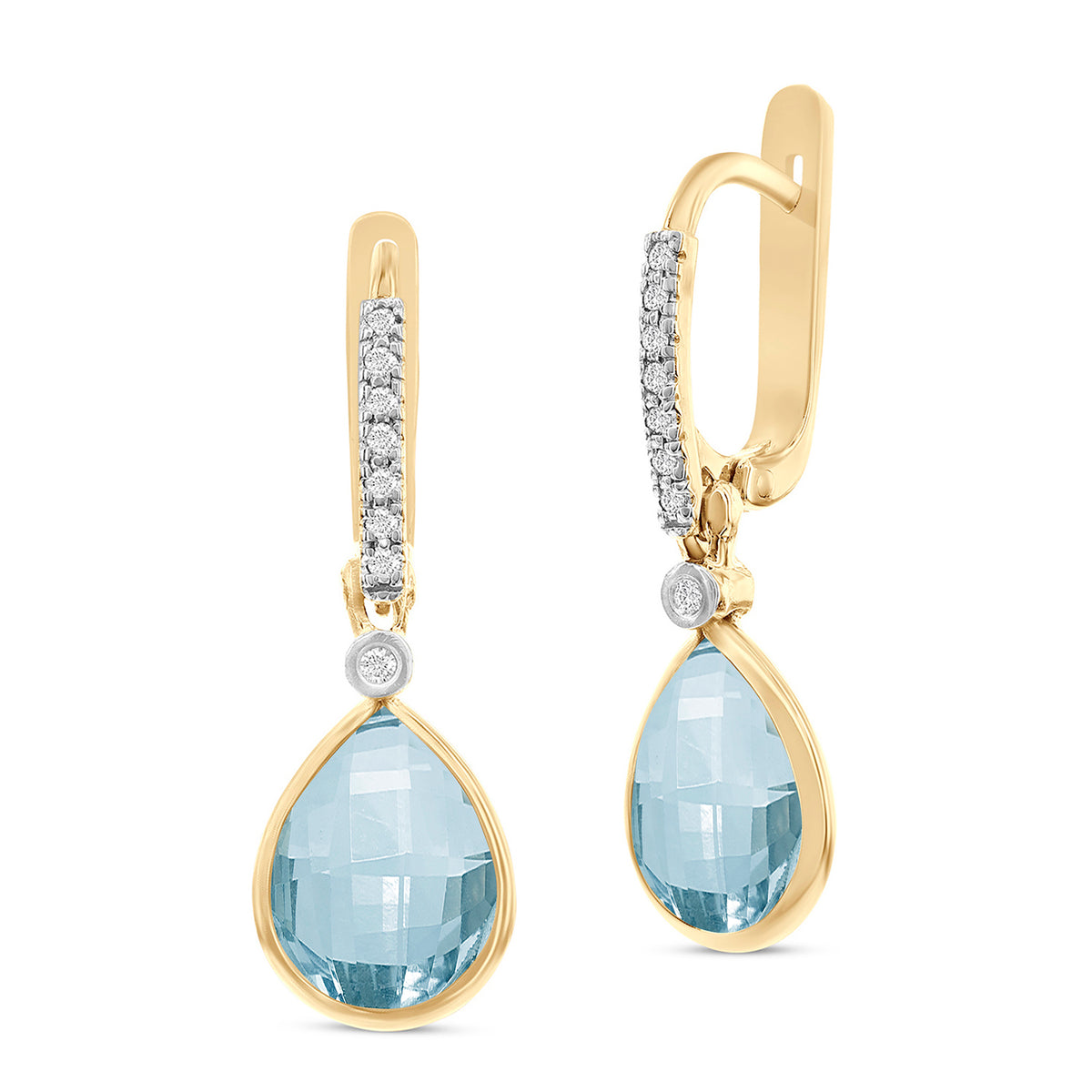 14 karat yellow gold polish-finished dangling tear-drop earrings, set with checkerboard-cut blue topaz semi-precious color stones and accented with 0.14 carat diamonds