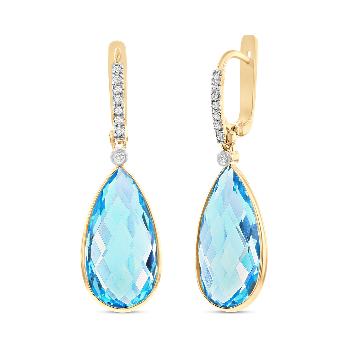 14 karat yellow gold polish-finished dangling tear-drop earrings, set with checkerboard-cut blue topaz semi-precious color stones and accented with 0.14 carat diamonds