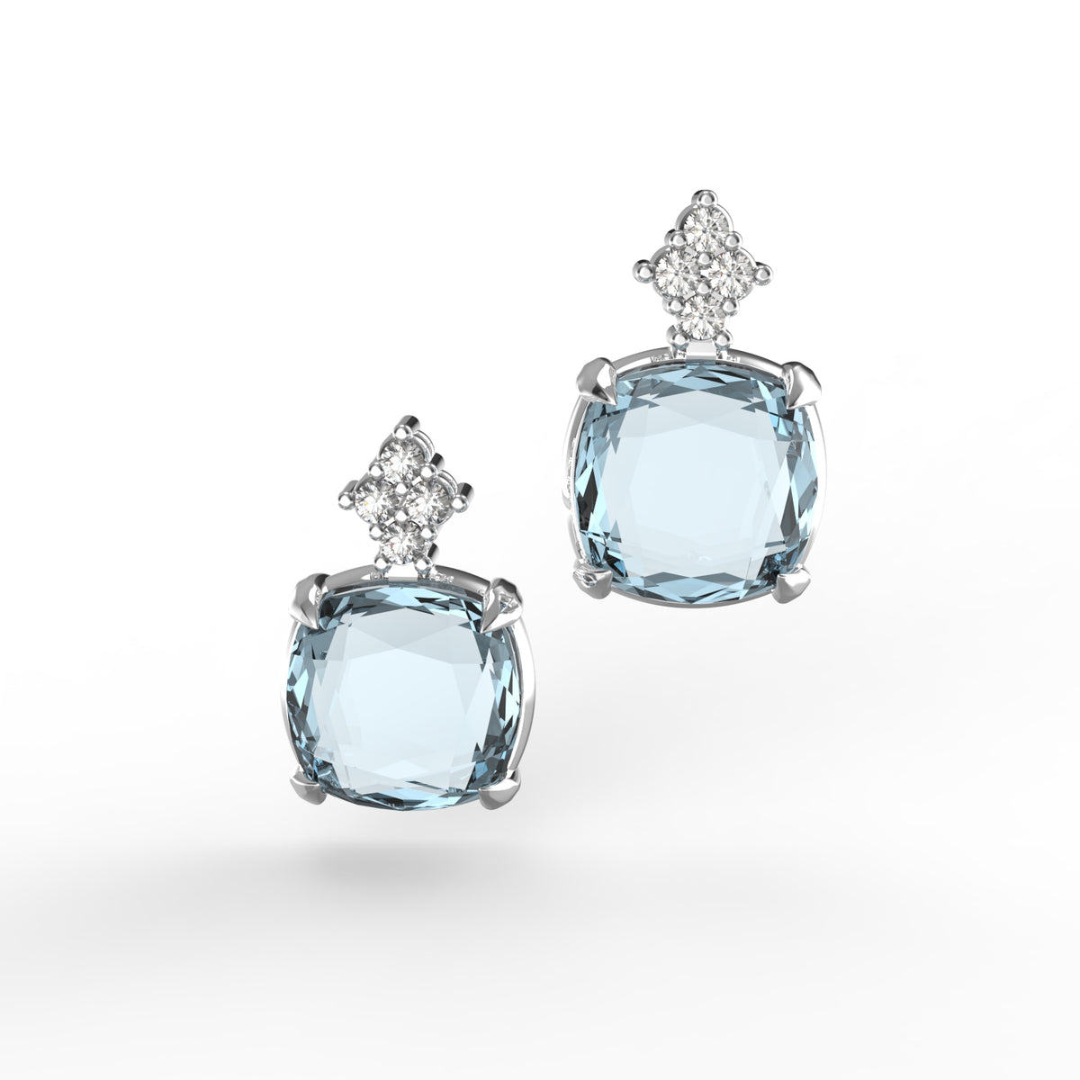 14 karat white gold polish-finished drop earrings, set with 9.2ct 10mm checkerboard-cut cushion-shaped semi-precious blue topaz color stones and accented with 0.20 carat diamonds