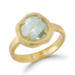 14 karat yellow gold matte and hammer-finished cocktail ring, centered with a round 8mm checkerboard-cut 1.75ct green amethyst semi-precious color stone