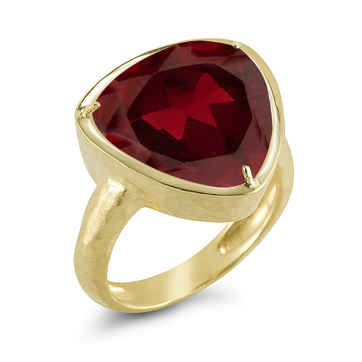 14 karat yellow gold matte and hammer-finished cocktail ring, set with a 15mm triangle-shaped checkerboard cut 12.25ct garnet semi-precious color stone.