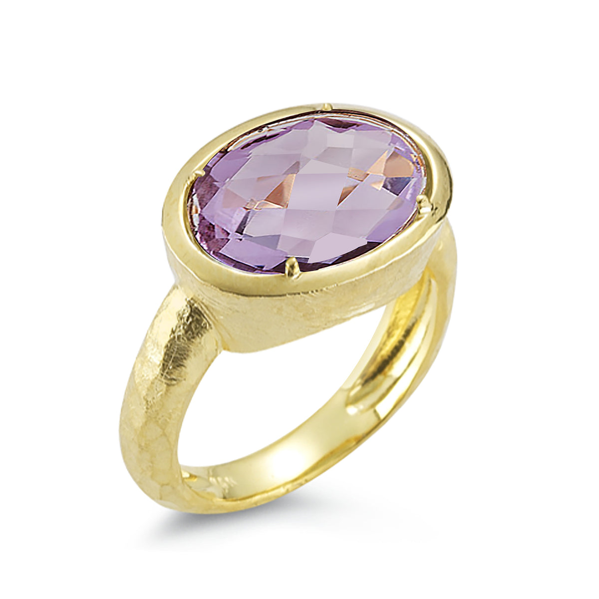 14 karat yellow gold matte and hammered-finished 16x12mm oval-shaped 8ct amethyst cocktail ring.