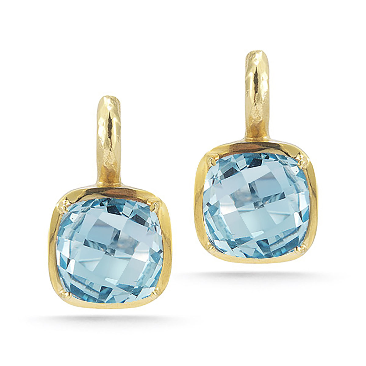 14 karat yellow gold matte and hammer-finished drop earrings, set with 9.2ct 10mm cushion-shaped checkerboard-cut blue topaz semi-precious color stones