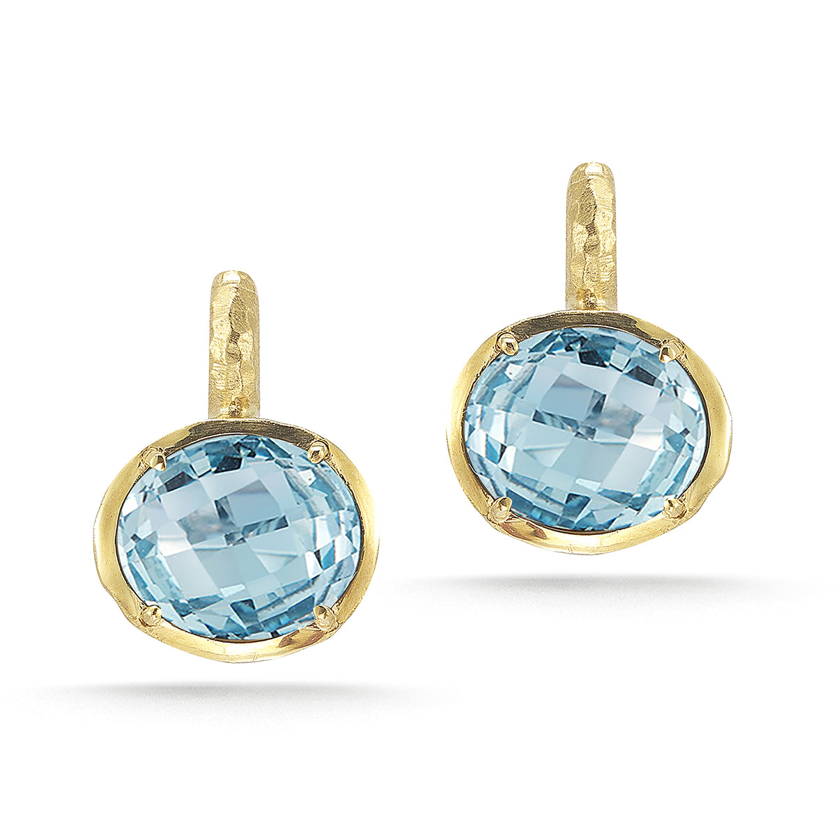 14 karat yellow gold matte and hammer-finished drop earrings, set with 13.6ct 10x14mm checkerboard-cut oval-shaped blue topaz semi-precious color stones