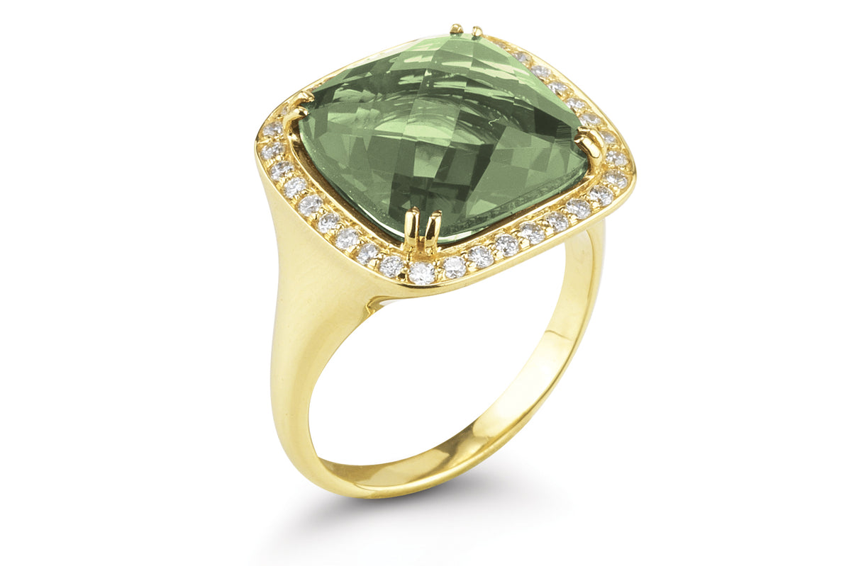 14 karat yellow gold polish-finish cocktail ring, centered with a 5.75ct 12mm checkerboard cushion-cut semi-precious green amethyst color stone, surrounded by 0.43 carats of pave set diamonds