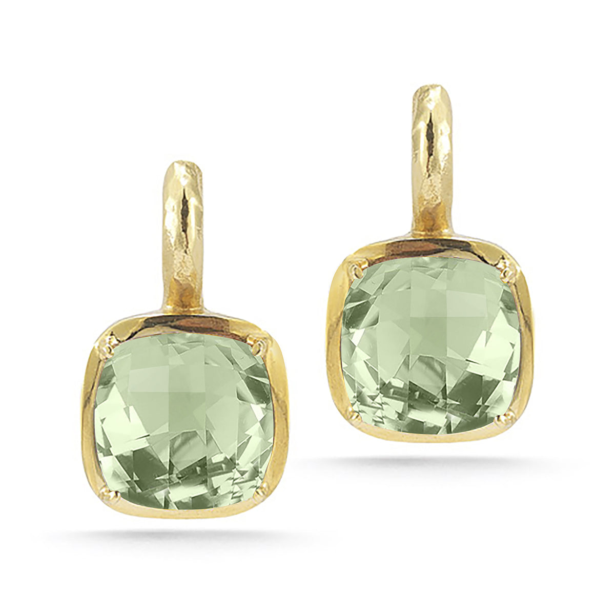14 karat yellow gold matte and hammer-finished drop earrings, set with 7.2ct 10mm cushion-shaped checkerboard-cut green amethyst semi-precious color stones