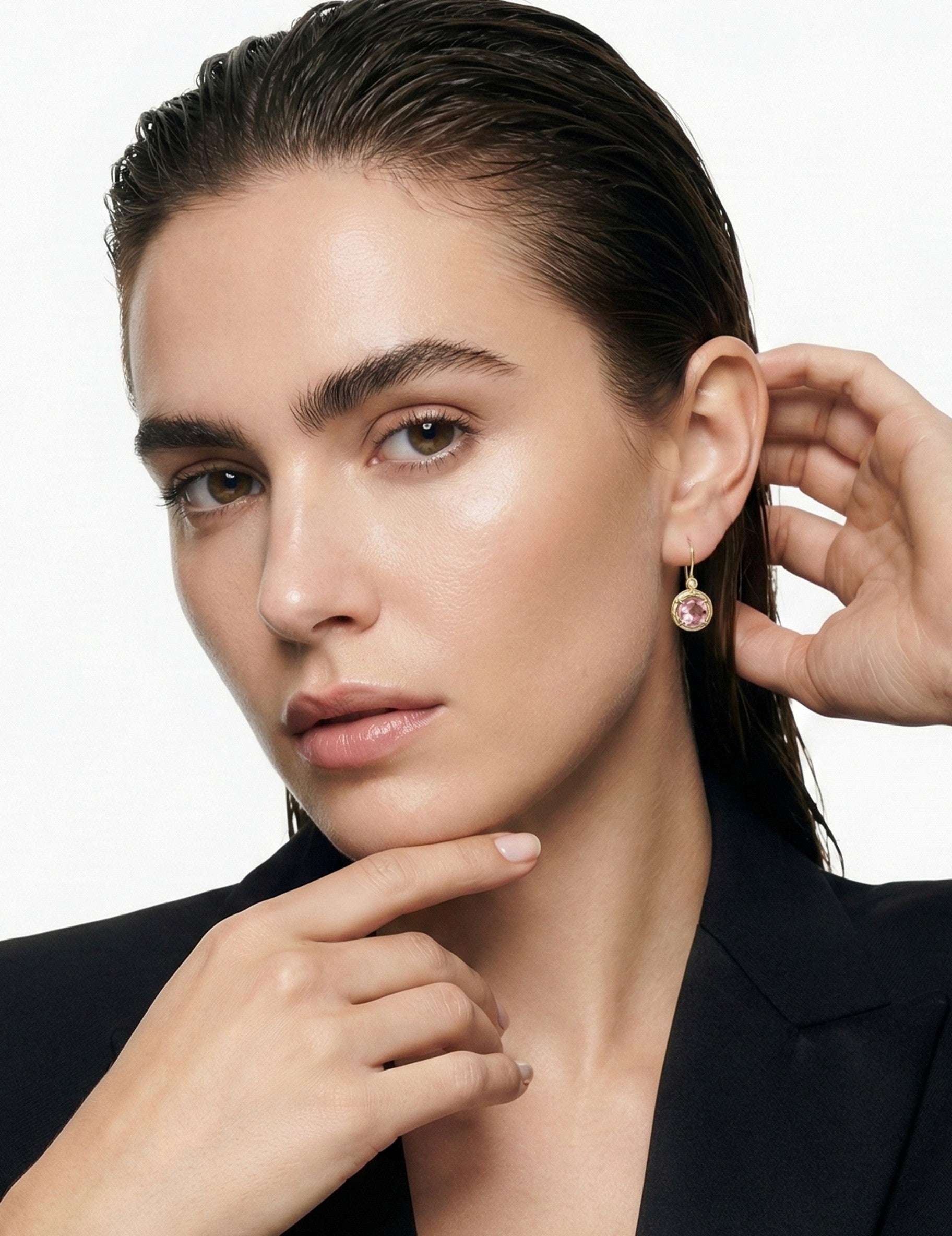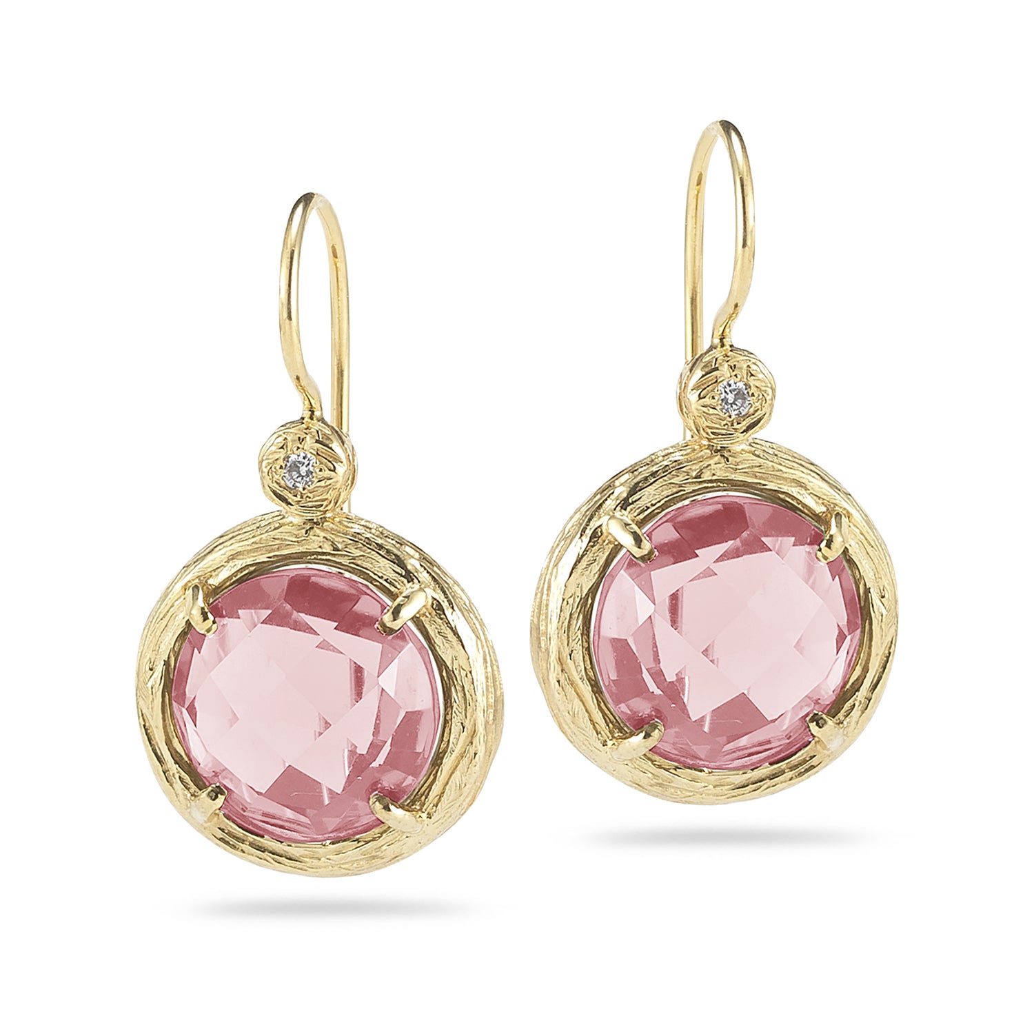 14 karat yellow gold polish-finished drop earrings, set with 6.5ct 10mm round checkerboard rose quartz semi-precious color stones, and accented with 0.03 carats of bezel set diamonds.