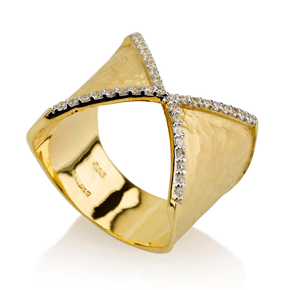 14 karat yellow gold matte and hammer-finish cuff ring enhanced with 0 20 carats of pave set diamonds