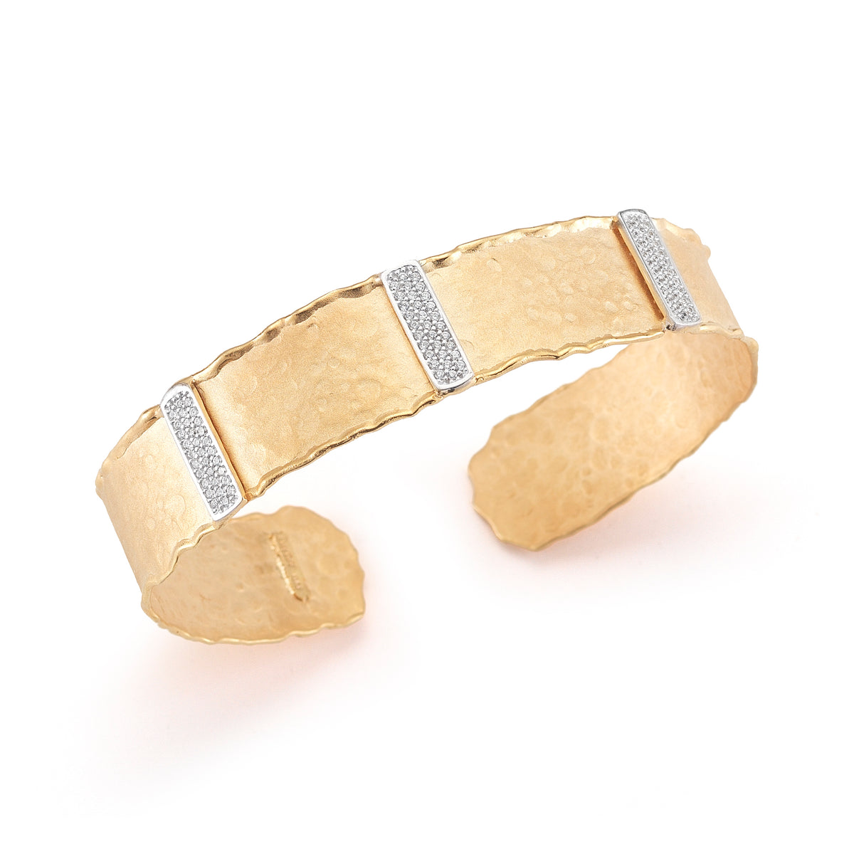 14 karat yellow gold matte and hammered-finish narrow cuff bracelet enhanced with 0 60 carats of pave set diamond bars