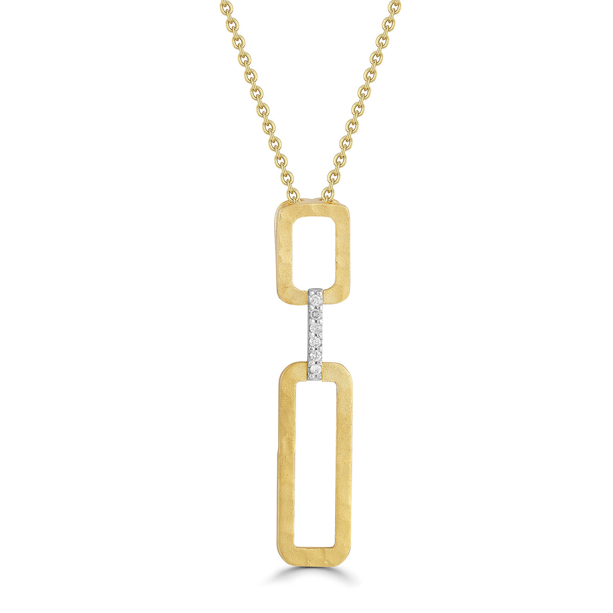 14 karat yellow gold matte-finished two open rectangles pendant, accented with 0.04 carats of a pave set diamond link, sliding on a 16" rolo chain
