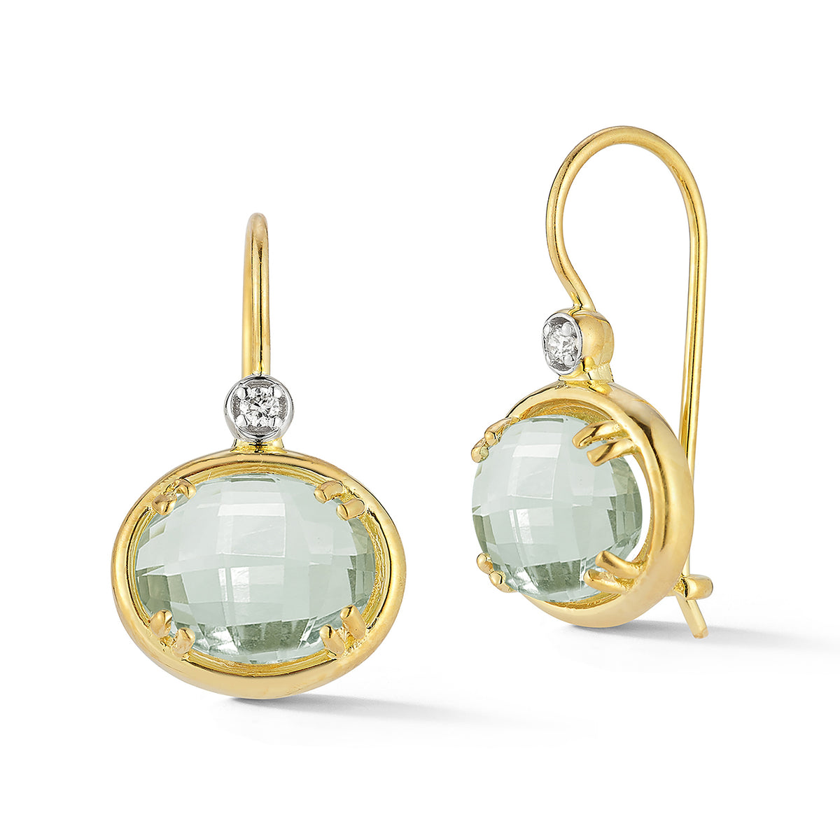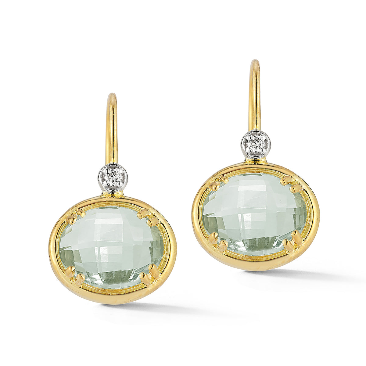 14 karat yellow gold polish-finished drop earrings, set with 8x10mm 5ct checkerboard-cut oval-shaped green amethyst semi-precious color stone earrings, accented with 0.05 carat diamonds
