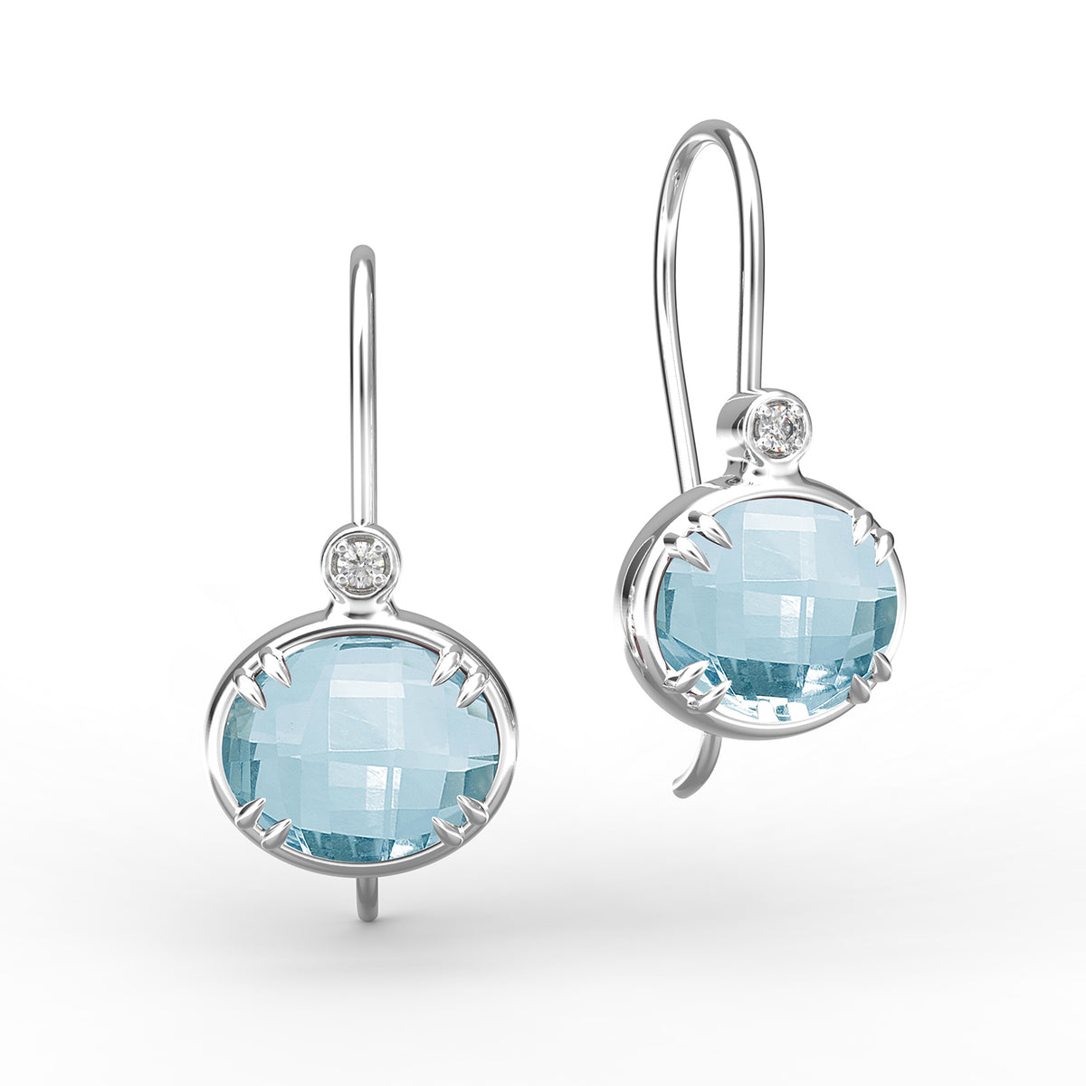 14 karat yellow gold polish-finished drop earrings, set with 8x10mm 6ct checkerboard-cut oval-shaped blue topaz semi-precious color stone earrings, accented with 0.05 carat diamonds
