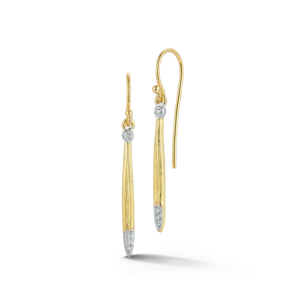 14 karat yellow gold polish and texture-finished dangling stick earrings, accented with 0.08 carats of pave set diamonds
