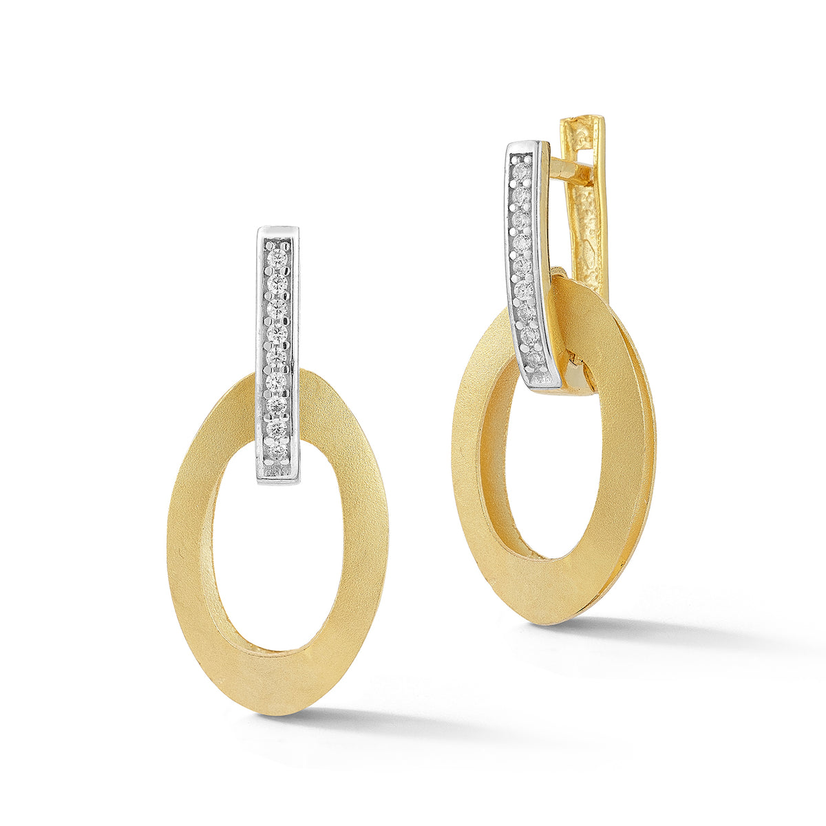 14 karat yellow gold matte-finished drop open oval-shaped earrings, accented with 0.11 carats of pave set diamond lever back findings