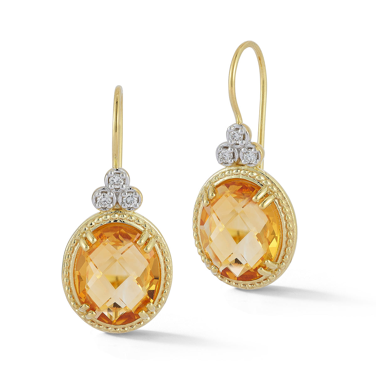 14 karat yellow gold polish-finished beaded drop earrings, set with a 12x10mm oval-shaped checkerboard-cut 7.8ct citrine semi-precious color stones, accented with 0.12 carat diamonds