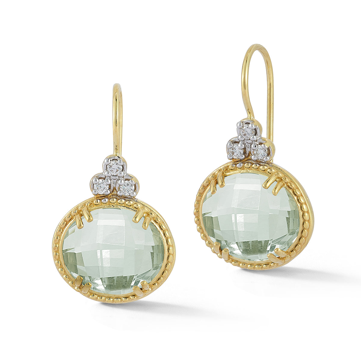 14 karat yellow gold polish-finished beaded drop earrings, centered with an 10x12mm 7.4ct oval-shaped checkerboard-cut green amethyst semi-precious color stone earrings, set with 0.13 carats of bezel set diamonds