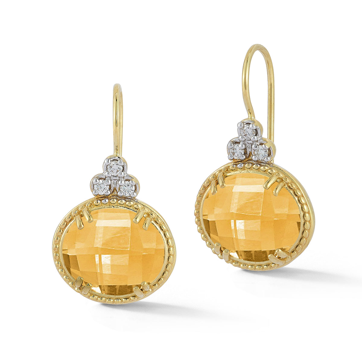 14 karat yellow gold polish-finished beaded drop earrings, centered with an 10x12mm 7.8ct oval-shaped checkerboard-cut citrine semi-precious color stone earrings, set with 0.13 carats of bezel set diamonds