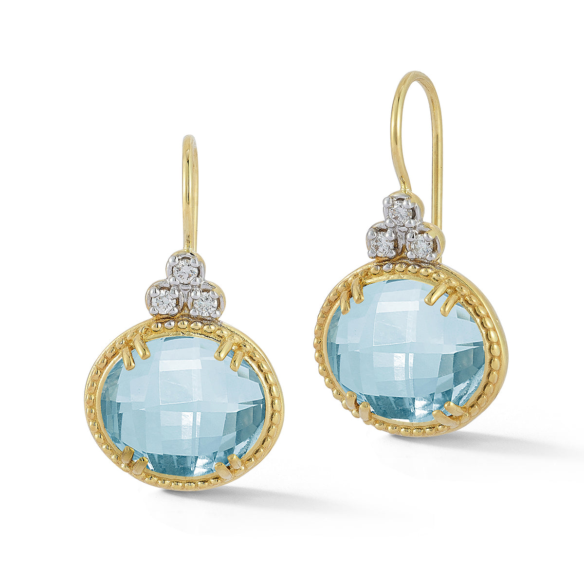 14 karat yellow gold polish-finished beaded drop earrings, centered with an 10x12mm 9.6ct oval-shaped checkerboard-cut blue topaz semi-precious color stone earrings, set with 0.13 carats of bezel set diamonds