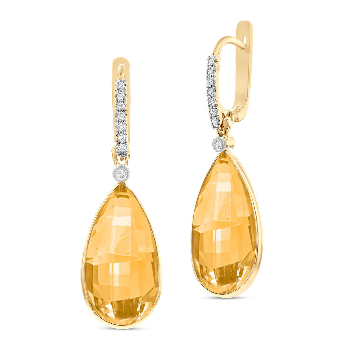 14 karat yellow gold polish-finished dangling tear-drop earrings, set with checkerboard-cut citrine semi-precious color stones and accented with 0.14 carat diamonds