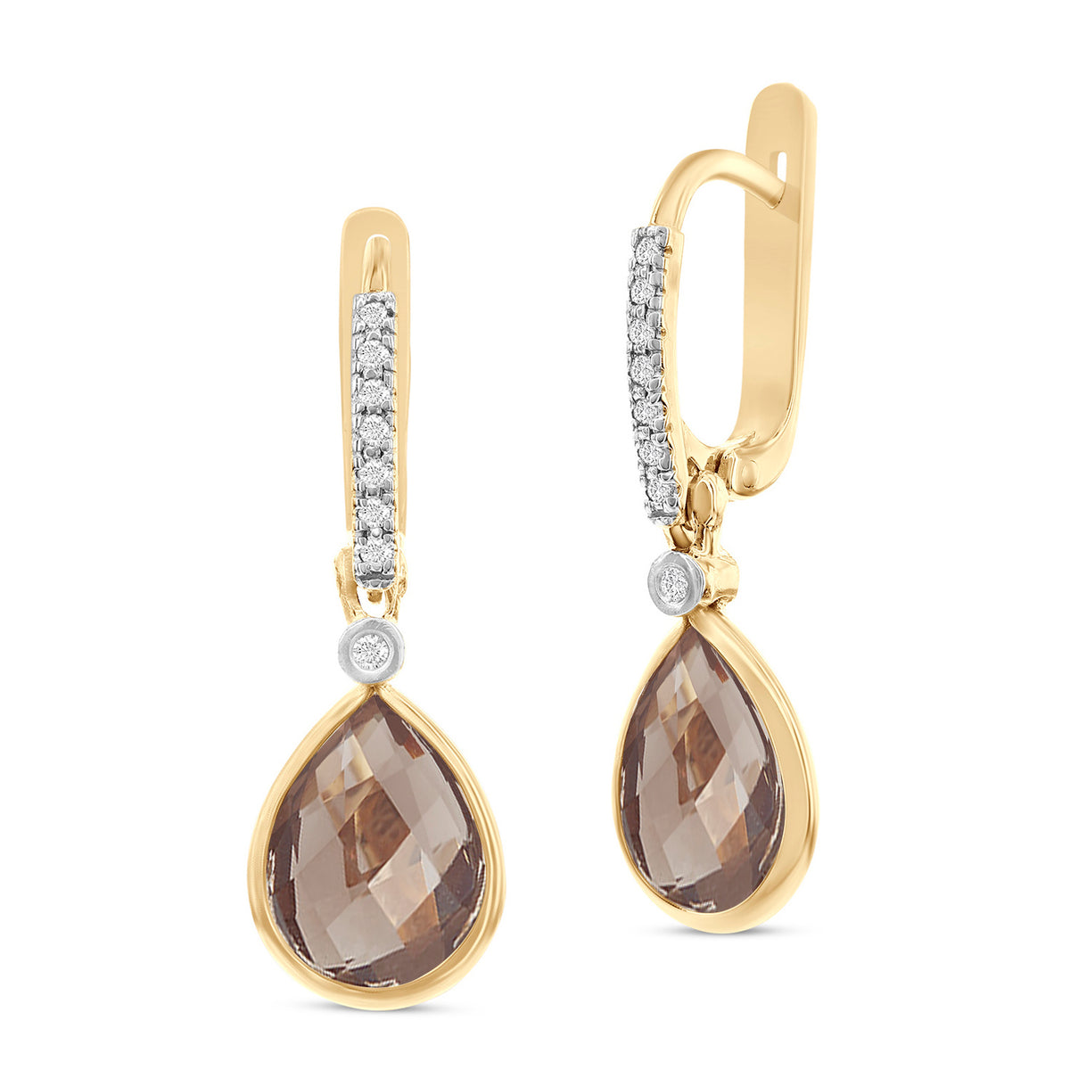14 karat yellow gold polish-finished dangling tear-drop earrings, set with checkerboard-cut smokey topaz semi-precious color stones and accented with 0.14 carat diamonds